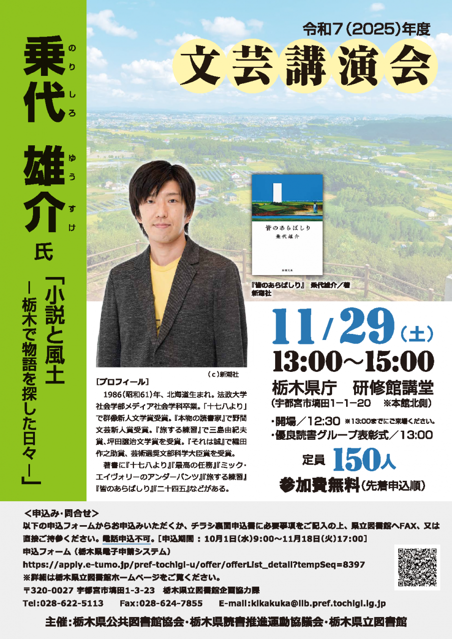 今年度は、栃木市皆川城址が舞台の『皆のあらばしり』、足利市が舞台の「生き方の問題」(『最高の任務』所収)等を執筆された、乗代雄介氏を講師にお招きします。以下のとおり開催します。