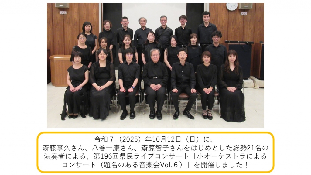 令和7(2025)年10月12日(日)に、第196回県民ライブコンサート「小オーケストラによるコンサート(題名のある音楽会Vol.6)」を開催しました。