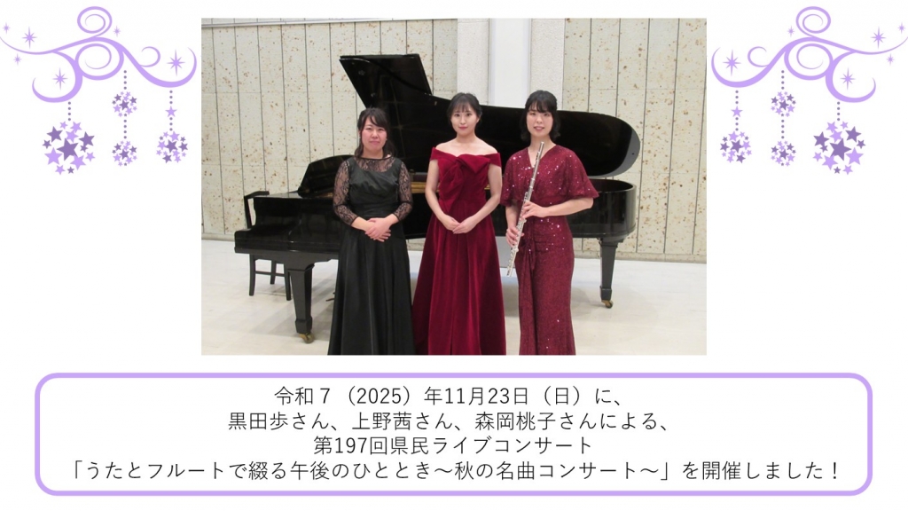 令和7(2025)年11月21日(日)に、第197回県民ライブコンサート「うたとフルートで綴る午後のひととき~秋の名曲コンサート~」を開催しました。